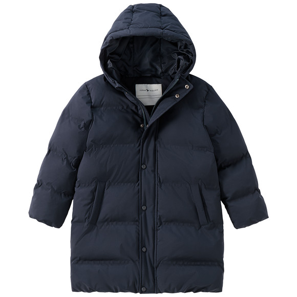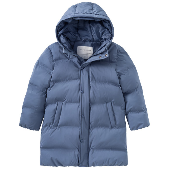Warme, gewatteerde pufferjas in effen blauw met een korte opstaande kraag, capuchon en elastische armsgaten. Met kinbeschermer aan de ritssluiting en drukknoopsluiting en twee met fleece gevoerde steekzakken die met drukknopen kunnen worden gesloten. Extra zak met rits aan de binnenkant. Lang model en warm.
