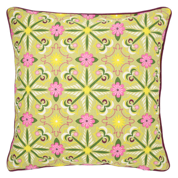 Kussensloop van onderhoudsvriendelijk katoen met een kleurrijk allover patroon en gekleurde bies rondom in het blauw. Praktisch met ritssluiting. Zonder vulling.