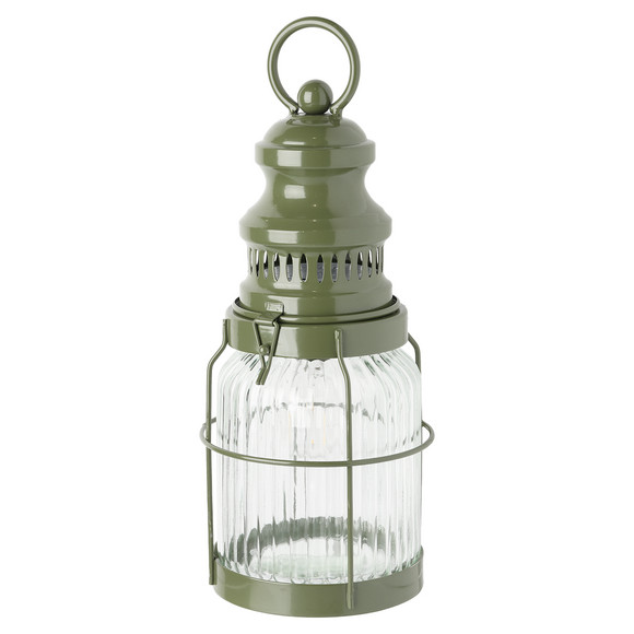 Metalen stormlamp in donkergroen. Met led-lamp en geribbeld glas. De bovenkant van de lamp kan worden geopend om bij de aan/uit-schakelaar te komen. Werkt op 2x AAA 1,5 V batterijen (niet bijgeleverd).