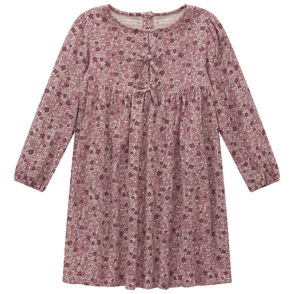 Crèmekleurige jurk van zachte mousseline met een all-over print van kleine bloemetjes. Ronde hals met knoopsluiting aan de achterkant. Scheidingsnaad onder de borst, geaccentueerd met twee decoratieve strikken. Lange mouwen met elastische manchetten. Licht uitlopende pasvorm.