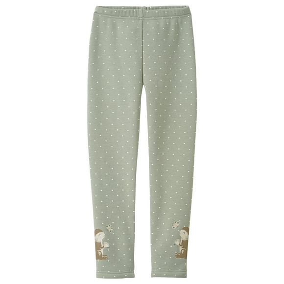 Gagekleurige Leggings met overal kleine witte hartjes en een print van eekhoorntjes met een beetje glitter op elke beenopening. Behaaglijk zachte voering en elastische tailleband aan de binnenkant.