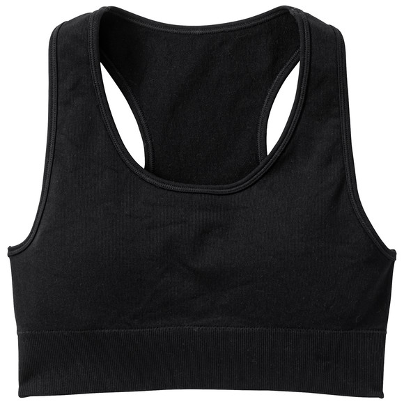 Zwarte bustier met een fijne geribbelde structuur en biezen. Dubbellaags aan de voorkant en racerback aan de achterkant. Elastische geweven tailleband onderaan.