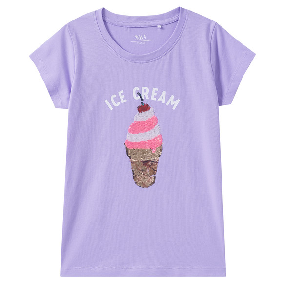 Lichtpaars T-shirt met ijsmotief van omkeerbare pailletten op de voorkant. Met aangezette boord langs de ronde hals.