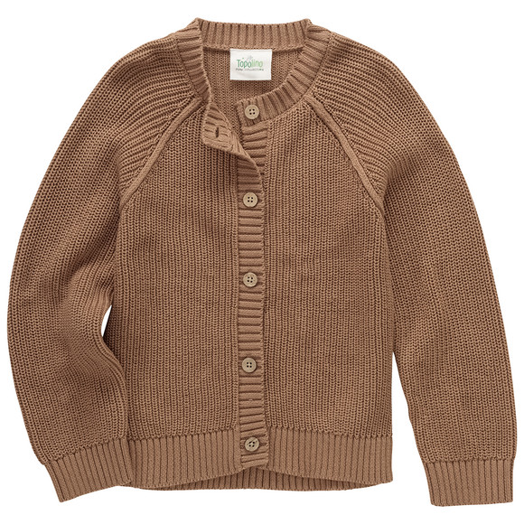 Lichtbruin vest van gecertificeerd biologisch katoen met een comfortabele ribboord. Met raglanmouwen en knoopsluiting. Geribde ronde hals, armsgaten en zoom.