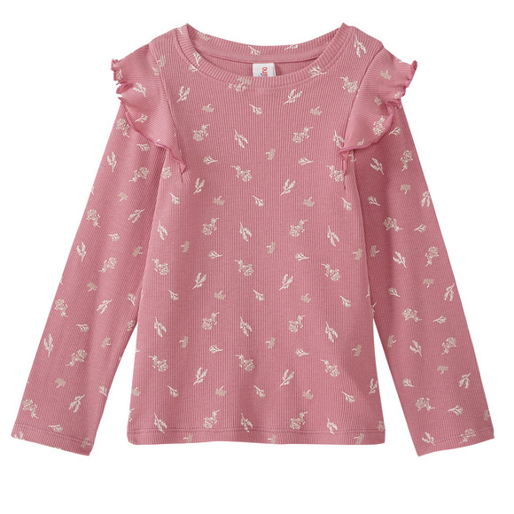 Roze shirt met lange mouwen van gecertificeerd biologisch katoen in fijne ribkwaliteit en met bloemen all-over. Met een ronde hals en ruches op de schouders.