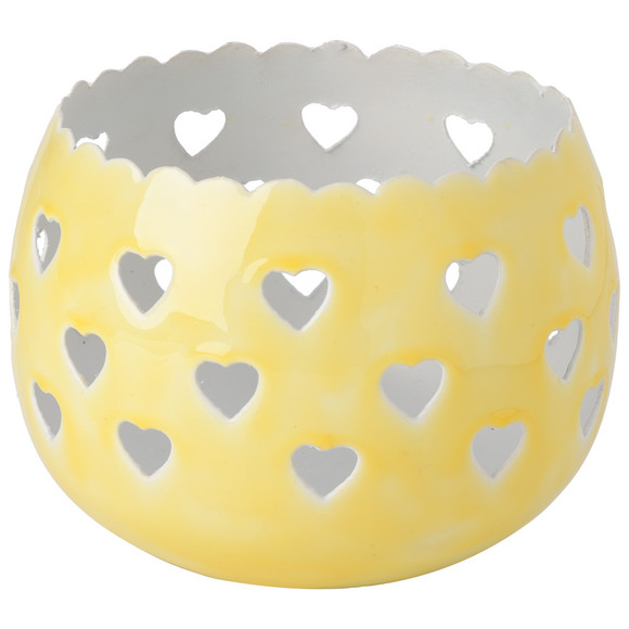 Roze metalen theelichthouder in ronde vorm. Met uitgestanste hartjes over het hele oppervlak. Binnenkant in effen wit.