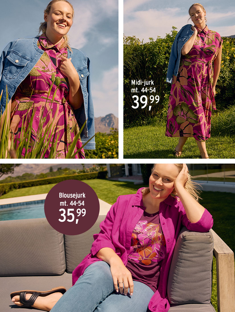 Stijlvol roze wordt gecombineerd met diepgroen, bloemmotieven en een opvallende luipaardprint. Luchtige silhouetten in denimblauw en olijfgroen flatteren je rondingen en bieden talloze mogelijkheden voor moeiteloze combinaties.
