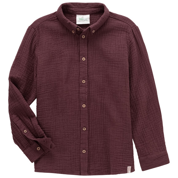 Wijnrood mousseline overhemd van gecertificeerd biologisch katoen. Klassieke Kent-kraag, doorlopende knoopsluiting met knopen met houteffect en enkele knoopmanchetten aan de lange mouwen. Los, recht model met een licht afgeronde zoom. Mousseline is een bijzonder zachte stof van puur katoen met een levendige kreuktextuur.