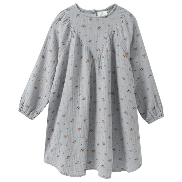 Grijze mousseline jurk van gecertificeerd biologisch katoen met delicate all-over bloemen. Met een ronde halslijn en knoopsluiting in de nek. Extra wijd met iets afgezakte schouders, elastiek aan de mouwen en een afgeronde zoom voor een casual look. Mousseline is een bijzonder zachte stof van puur katoen met een levendige kreuktextuur.