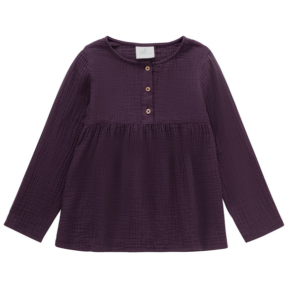 Beerkleurige mousseline blouse van gecertificeerd biologisch katoen. Ronde hals met korte knoopsluiting aan de voorkant. Deelnaad onder de borst. Licht uitlopend model. Mousseline is een bijzonder zachte stof van puur katoen met een levendige kreuktextuur.