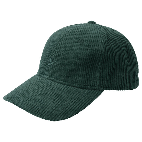 Donkerblauwe pet van trendy corduroy. Aan de voorkant met subtiel vogelborduursel. Verstelbaar in de breedte.