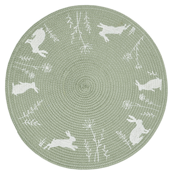 Ronde placemat in Pasen-design. Met kleine borduursels en opdruk.