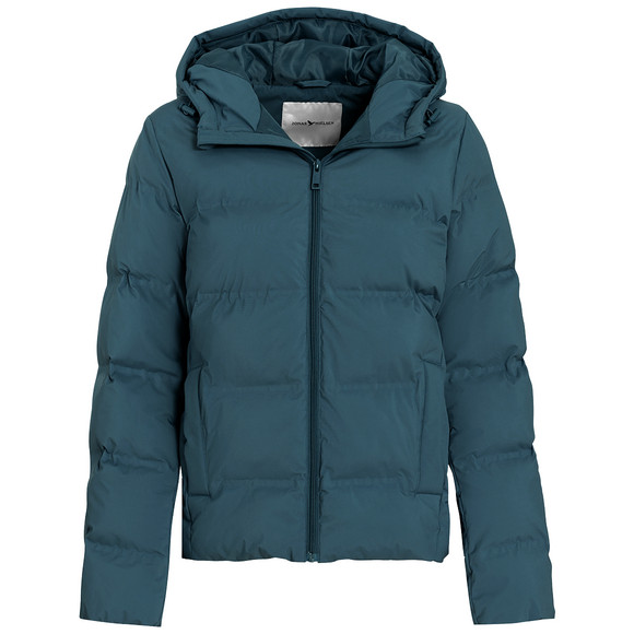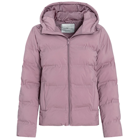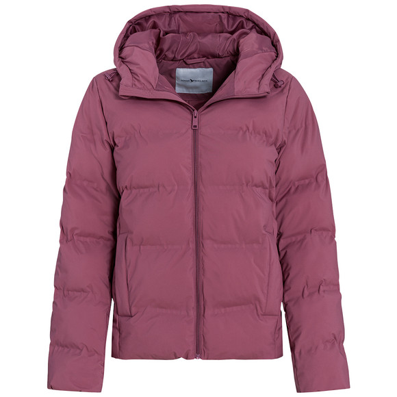Pufferjas in donkerroze met gerecycled materiaal in warme gewatteerde kwaliteit. Capuchon en zoom met verstelbaar trekkoord. Doorlopende ritssluiting met kinbescherming. Twee zakken aan de zijkanten, afsluitbaar met een drukknoop.