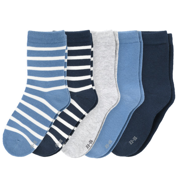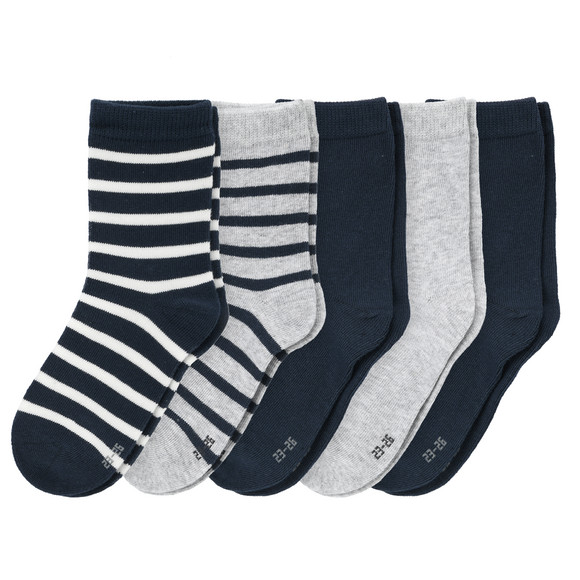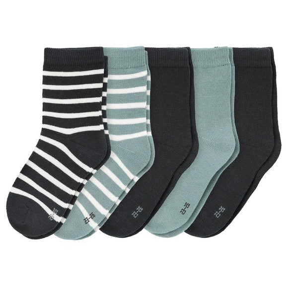 Vijf paar sokken van comfortabel biologisch katoen in effen donkergrijs en saliegroen, en donkergrijs en saliegroen met witte strepen. Elastische tailleband voor een hoog draagcomfort.
