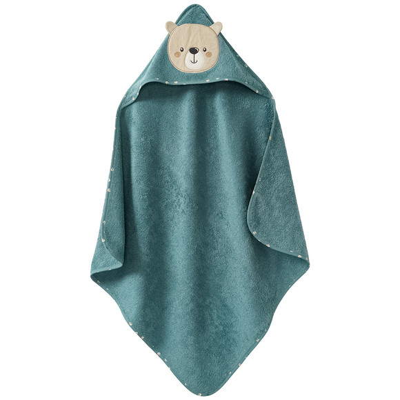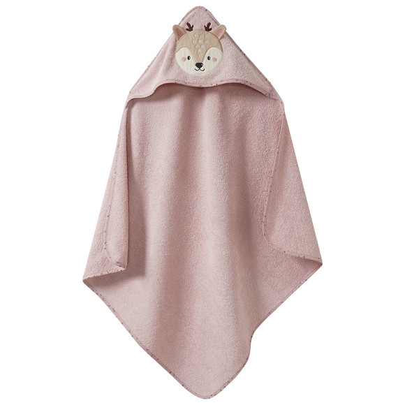 Gezellige sjaal met capuchon van zachte katoenen badstof in roze met een schattige hertenapplicatie. Afgewerkt met een bies bij de hals. Afmetingen ca. 80 x 80 (bxl).