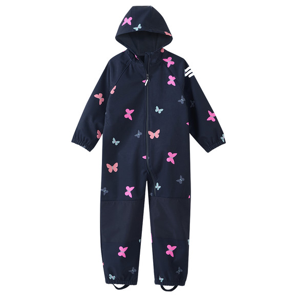 Eendelige softshell-overall in donkerblauw met vlinders over het hele oppervlak. Hoog sluitende capuchon en kinstuk bij de lange rits. Raglanmouwen met reflecterende elementen. Slijtvaste inzetstukken bij de knieën en het zitvlak. Met elastische mouw- en beenopeningen en een elastische tailleband voor een perfecte pasvorm. Aan de binnenkant gevoerd met zacht fleece.