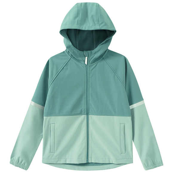 Saliekleurig softshelljack met donkerturquoise accenten, een hoog afsluitende capuchon, een kinbescherming bij de rits en twee steekzakken aan de voorkant. Mouwen met elastische boorden. Met reflecterende strepen op de mouwen en een opschrift op de achterkant. Van binnen knus gevoerd met fleece.