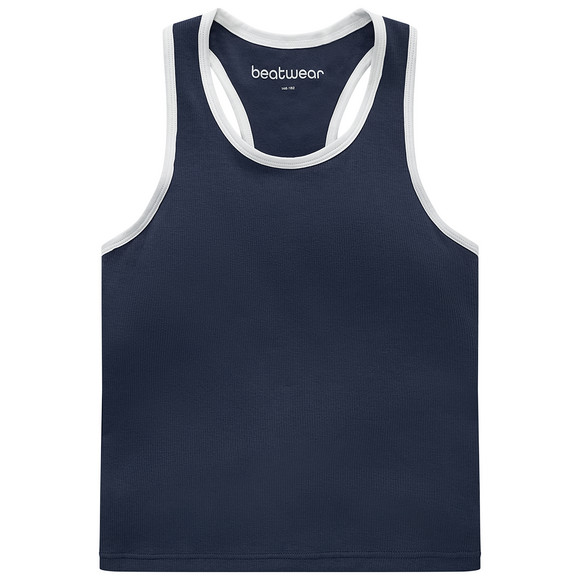 Sportieve top in donkerblauw met fijne ribstructuur. Witte biesjes voor een coole look. Achteraan met racer-back. Gestikte bustier met elastische band.