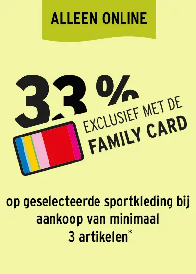 De korting is geldig van 08-10-2025 tot 02-11-2025 voor alle gemarkeerde artikelen van themawereld ‘Sportmode voor dames’ en ‘Sportmode voor heren’ en uitsluitend met de Family Card. Bij aankoop van 3 artikelen ontvangt u een korting van 33%. Geldig in de onlinewinkel en de app van Ernsting's family. Online exclusieve artikelen kunnen in alle winkels van Ernsting's family besteld worden. Dit geldt niet voor tegoedbonnen en verzendkosten. Online bestellingen kunnen na afhaling in het filiaal niet nog van een korting worden voorzien. Niet combineerbaar met andere (actie-)kortingen. De korting wordt aan het einde van het betalingsproces automatisch berekend.