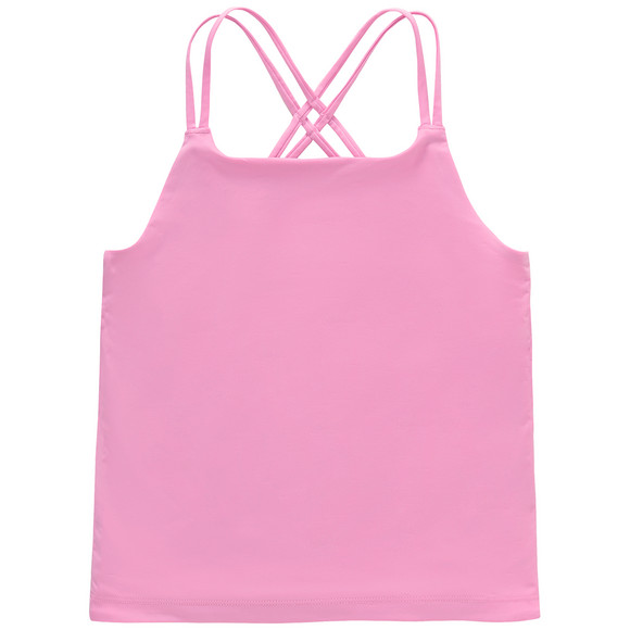 Lichtblauwe top gemaakt van lichte functionele stof. Met ronde hals en dubbele gekruiste spaghettibandjes op de rug. Kleine tekstprint op de achterkant. Dubbel gelaagd en nauwsluitende pasvorm.