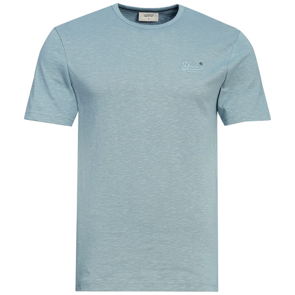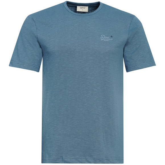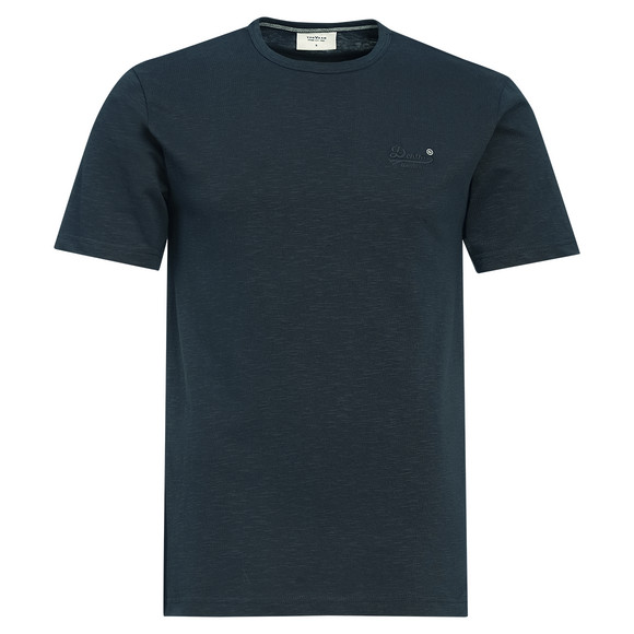 Donkerblauw T-shirt met vlammengaren en klein borduurwerk op de borst. Met ronde hals en rechte pasvorm.