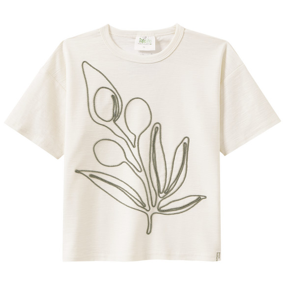 Crèmewit T-shirt gemaakt van vlamgaren met bloemenmotief van fijn koord. Ronde hals met bies.