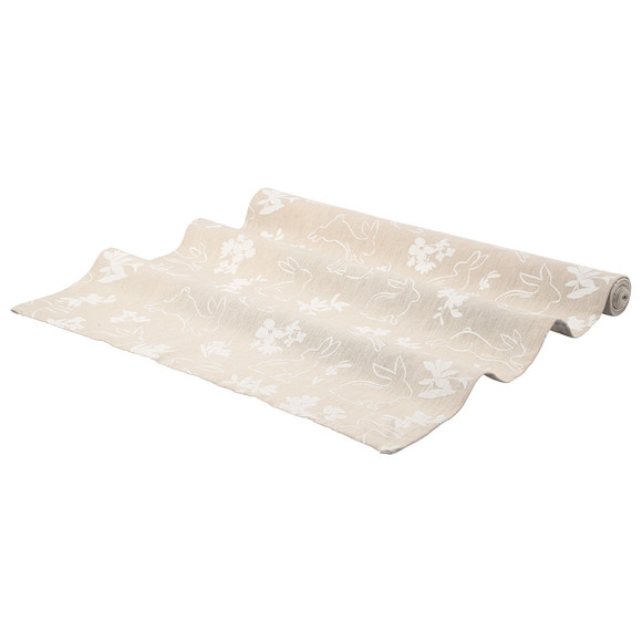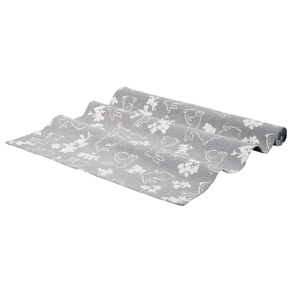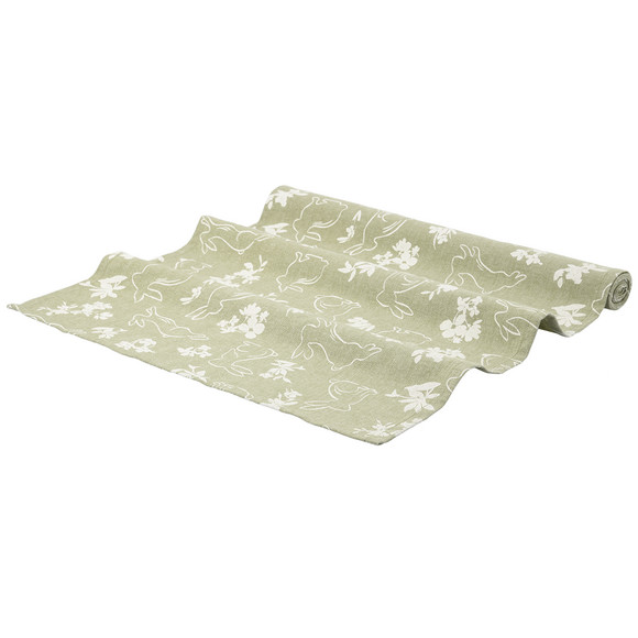 Groene tafelloper met verschillende paasmotieven in wit allover. Met omzoomde sluitingen.