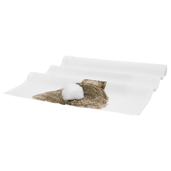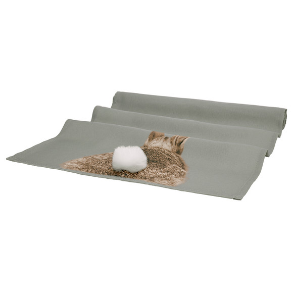 Donkergrijze tafelloper met konijnenprint aan de korte zijden en 3D-applicatie. Volledig omzoomd.