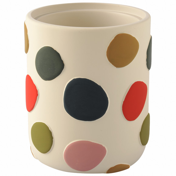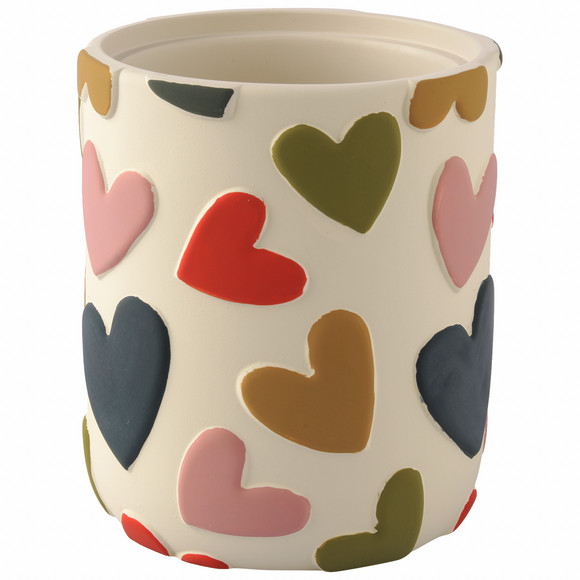 Roomwitte tandenborstelbeker met kleurrijke hartjes erop. Afmetingen ca. 8 x 10 cm (ØxH).