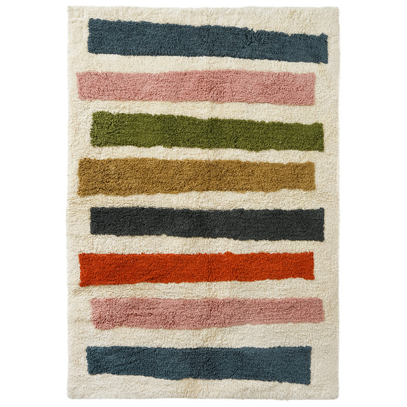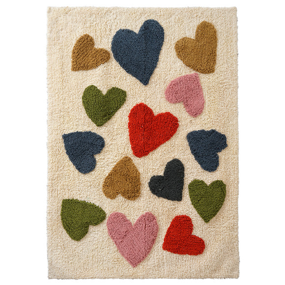 Crèmekleurig vloerkleed van aangenaam katoen met kleurrijke hartjes erop. Met antisliprug. Afmetingen ca. 90 x 130 cm (bxl).