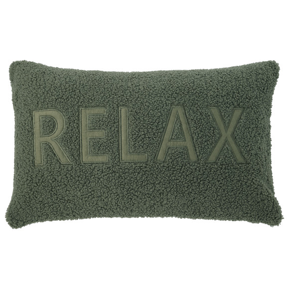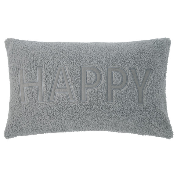 Grijze kussenhoes van zacht teddy-pluche met geborduurde letters op de voorkant. Fluweelzachte achterkant. Kan worden gesloten met een rits. Zonder vulling
