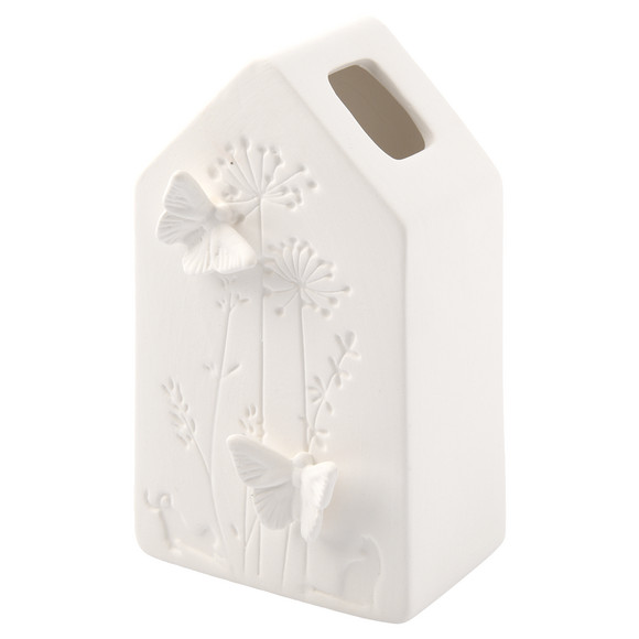 Witte keramische vaas in huisvorm. Met aangebrachte vlinders en een kleine opening aan de bovenkant.