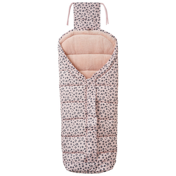 Gewatteerde wintervoetenzak in lichtroze met donkergrijs all-over patroon. Geschikt voor 3- en 5-puntsgordelsystemen, ideaal voor het babyzitje, de kinderwagen of het autostoeltje. Lange ritssluiting met extra klittenbandflap aan de voorkant. Praktische omslag met bindbandjes om aan de rugleuning van de kinderwagen of autostoel te bevestigen. Warmende binnenvoering van knuffelige teddyfleece. Het voetengedeelte met rondomlopende reflecterende strook kan worden geopend met een praktische tweewegritssluiting. Ca. 105 cm lang.