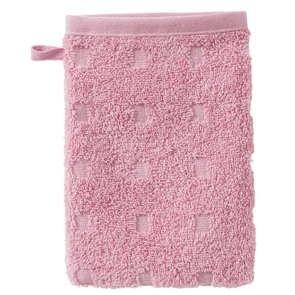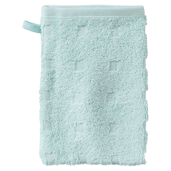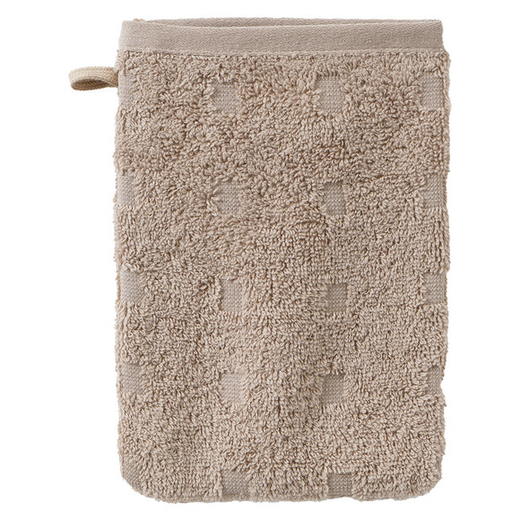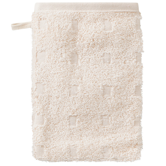 Crèmekleurig washandje van sterk absorberende badstof met kleine vierkantjes als ingeweven patroon. Omlijst aan de bovenrand en voorzien van een handige lus om op te hangen.