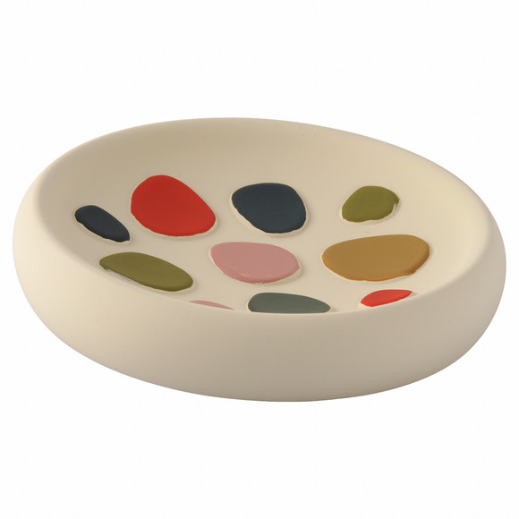 Rond zeepbakje in crèmewit met kleurrijke hartjes erop. Afmetingen ca. 10,5 x 2,5 cm (ØxH).